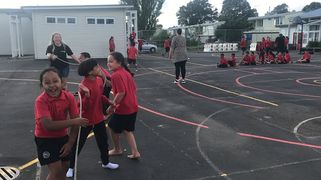 A few minutes later we got to the court. Mr Moran explained the rules to us and this is what he said "One team is going to do skipping with Miss Shanaia, Miss Duder, Miss King and Miss Scanlan. While the other 3 teams do relays with me. The team that is going to skipping is going to be Hinemoana. Now these are the rules. The first person in the line gets up and picks the skipping rope up, hops 2 times on the sipping rope, skip to the very end of the cones, skip 5 time and run back with the skipping rope." "Are you ready?!" Mr Moran shouted. "Yes!" The other teams exclaimed. ( I heard Mr Moran say it.)